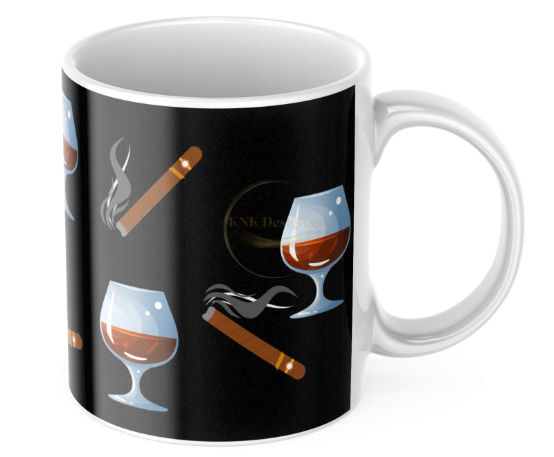 Чашата е с черен фон и изображение на пура и чаша с алкохол.